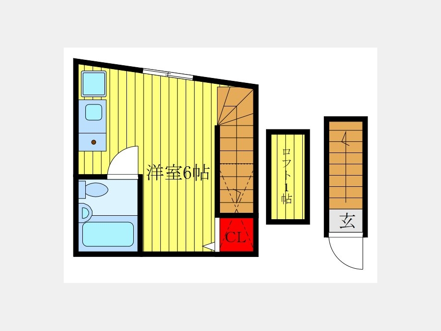 | 設備・条件 | 2階以上、最上階、角部屋、室内洗濯機置き場、フローリング、ロフト付き、エアコン、即入居可、礼金なし、敷金なし、保証人不要、TVドアホン、宅配ボックス、都市ガス | ||