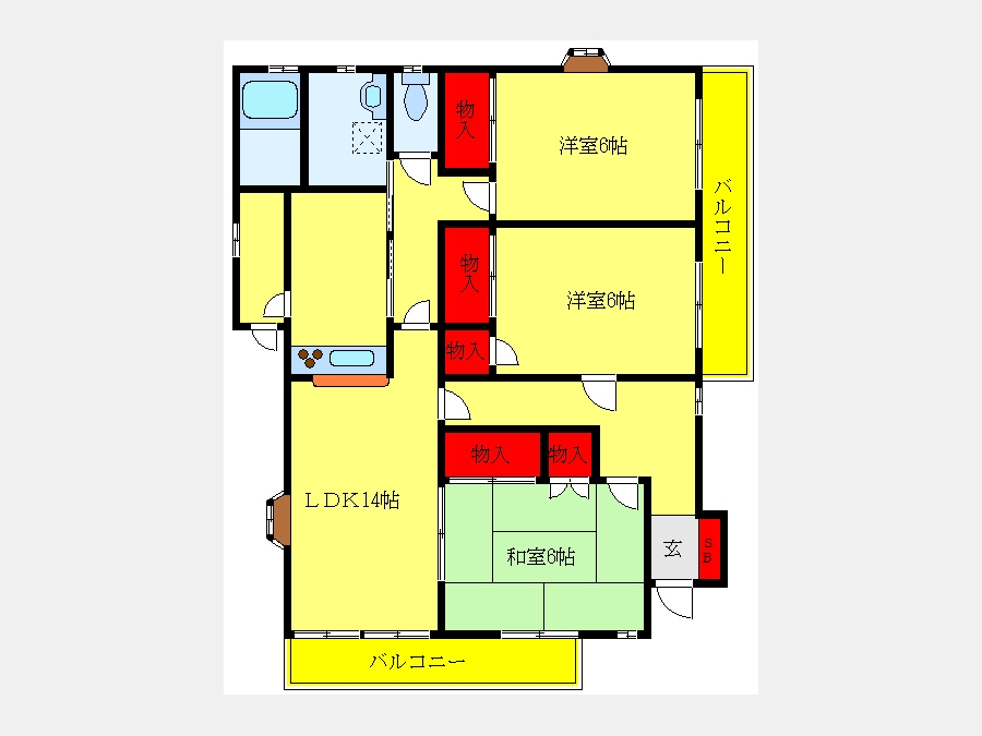 洋室 6 畳 LDK 14 畳 洋室 6 畳 和室 6 畳 S |