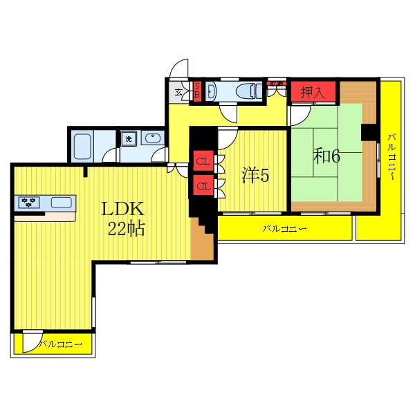 和室 6 畳 洋室 5 畳 LDK 22 畳 |