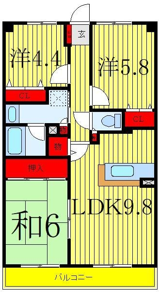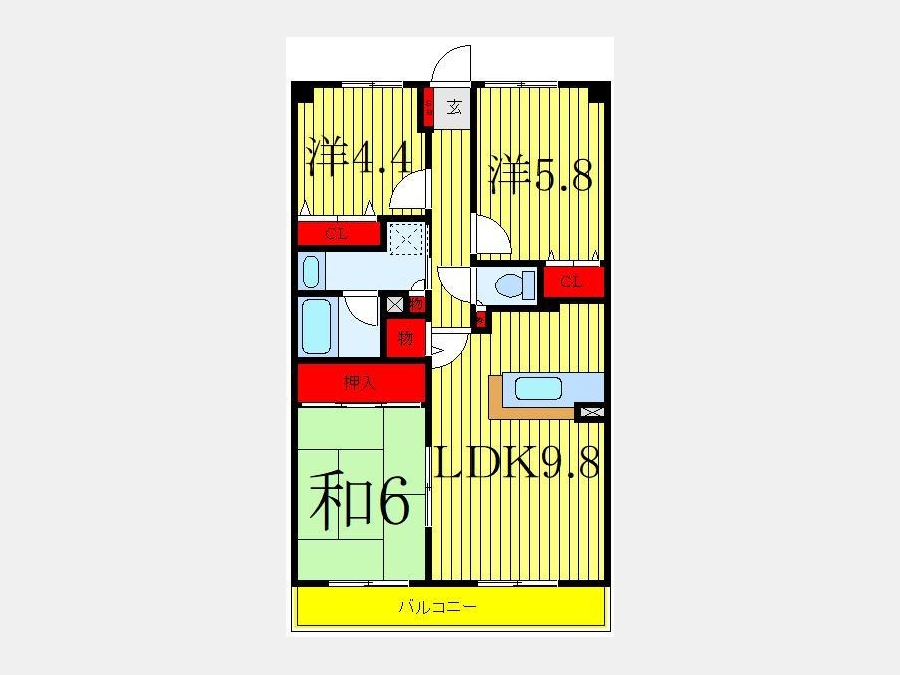 洋室 4.4 畳 洋室 5.8 畳 和室 6 畳 LDK 9.8 畳 |