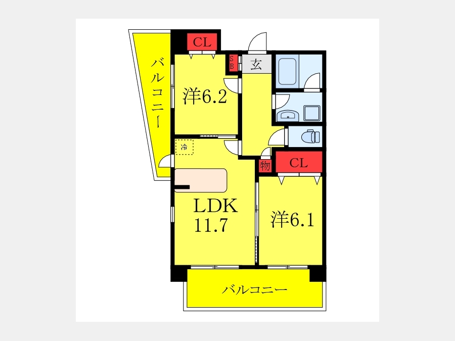 洋室 6.2 畳 1 室 洋室 6.1 畳 1 室 LDK 11.7 畳 1 室 |