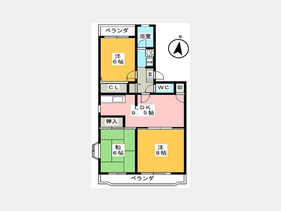LDK 9.5 畳 洋室 8 畳 洋室 6 畳 和室 6 畳 |