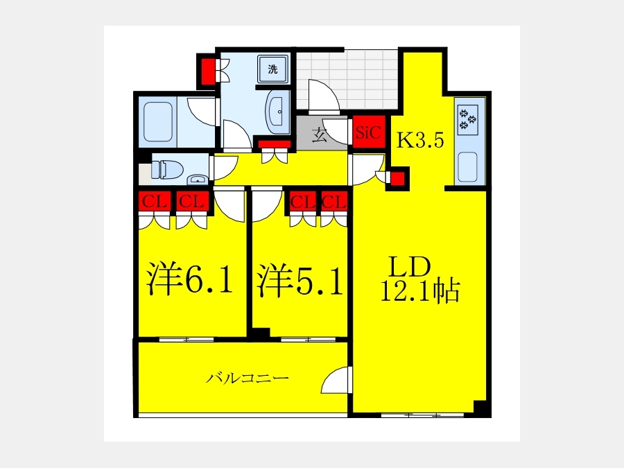洋室 6.1 畳 洋室 5.1 畳 LD 12.1 畳 K 3.5 畳 |