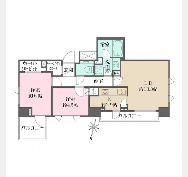 洋室 6 畳 洋室 4.5 畳 LD 10.3 畳 K 2.9 畳 |