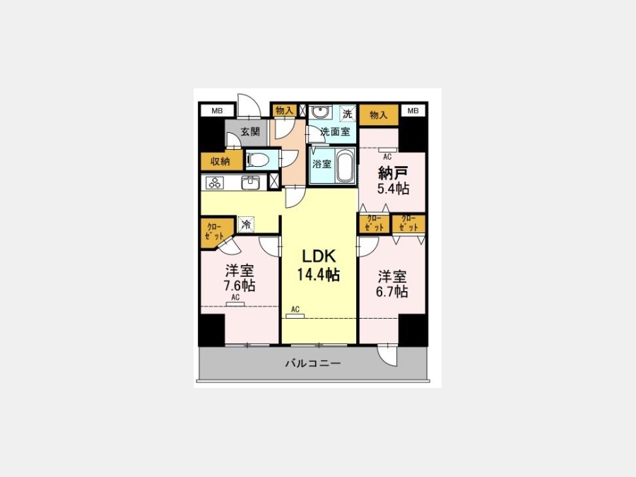 洋室 7.6 畳 洋室 6.7 畳 LDK 14.4 畳 S 5.4 畳 |