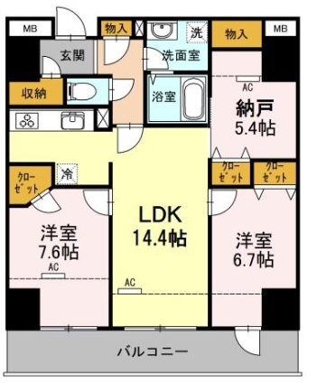 洋室 7.6 畳 洋室 6.7 畳 LDK 14.4 畳 S 5.4 畳 |