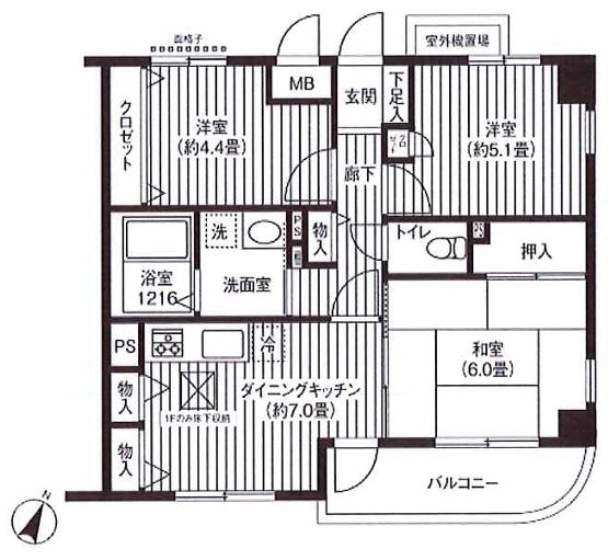 和室 6 畳 洋室 5.1 畳 洋室 4.4 畳 DK 7 畳 |