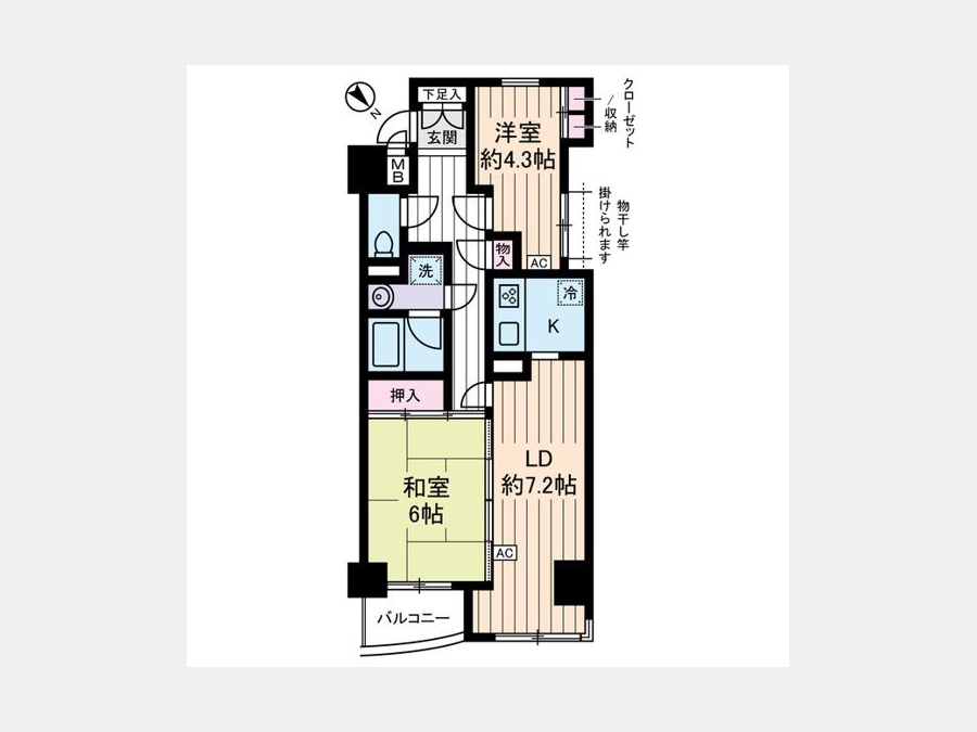 洋室 4.3 畳 1 室 和室 6 畳 1 室 LD 7.2 畳 1 室 K 1 室 |