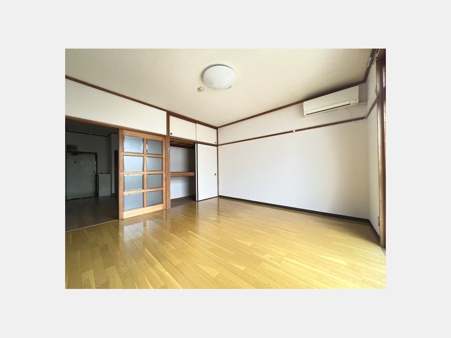 | 設備・条件 | 駐輪場、都市ガス、1階、南向き部屋、バス・トイレ別、フローリング、エアコン、バルコニー、礼金なし、敷金なし、保証人不要、2人入居相談、自社管理物件 | ||