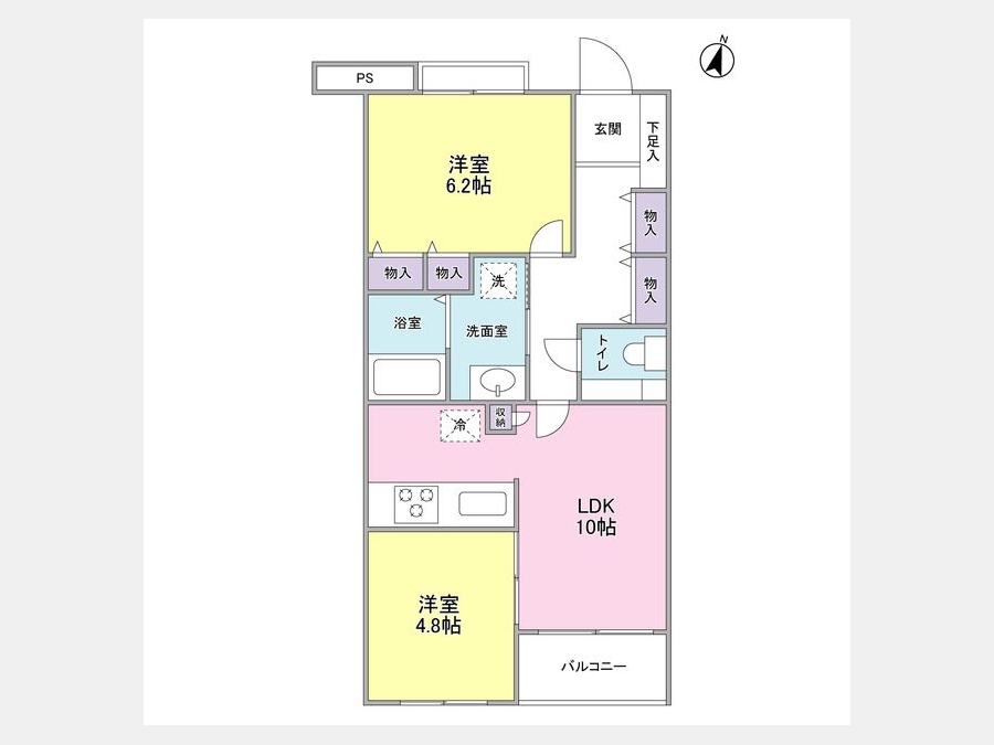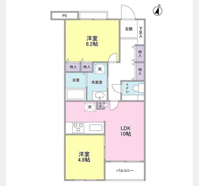 LDK 10 畳 洋室 6.2 畳 洋室 4.8 畳 |
