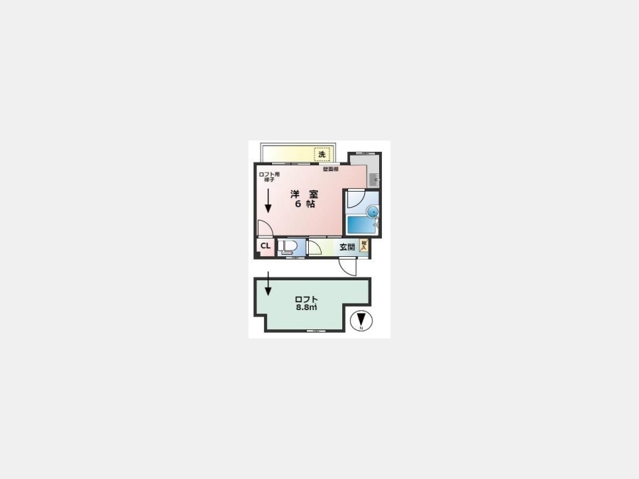 | 設備・条件 | 1階、南向き部屋、バス・トイレ別、温水洗浄便座、フローリング、ロフト付き、エアコン、バルコニー、即入居可、礼金なし、TVドアホン、都市ガス | ||