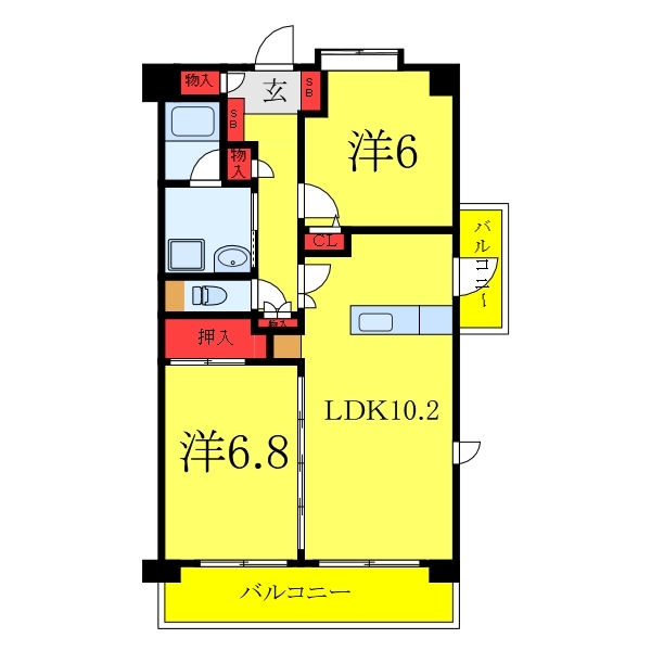 洋室 6.8 畳 洋室 6 畳 LDK 10.2 畳 |