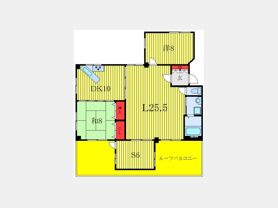 洋室 8 畳 和室 8 畳 S 6 畳 L 25.5 畳 DK 10 畳 |
