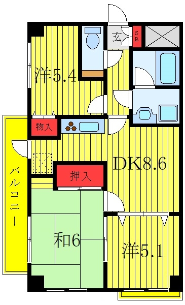 和室 6 畳 洋室 5.4 畳 洋室 5.1 畳 DK 8.6 畳 |