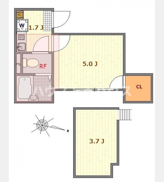 | 設備・条件 | 2階以上、最上階、システムキッチン、バス・トイレ別、浴室乾燥機、室内洗濯機置き場、フローリング、ロフト付き、エアコン、礼金なし、敷金なし、保証人不要、オートロック、都市ガス | ||