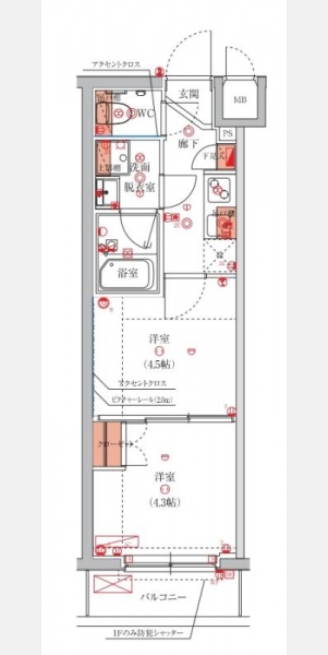 洋室 4.3 畳 洋室 4.5 畳 K 1 室 |