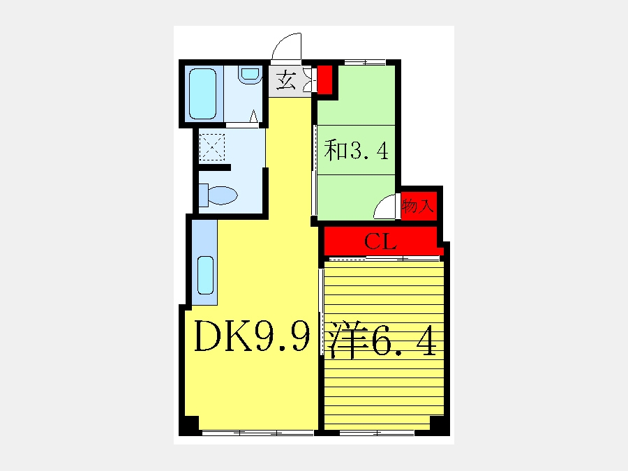 洋室 6.4 畳 和室 3.4 畳 DK 9.9 畳 |