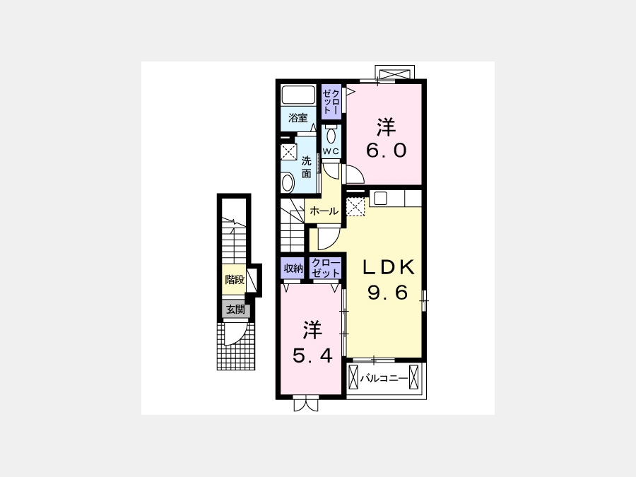 LDK 9.6 畳 洋室 6 畳 洋室 5.4 畳 |