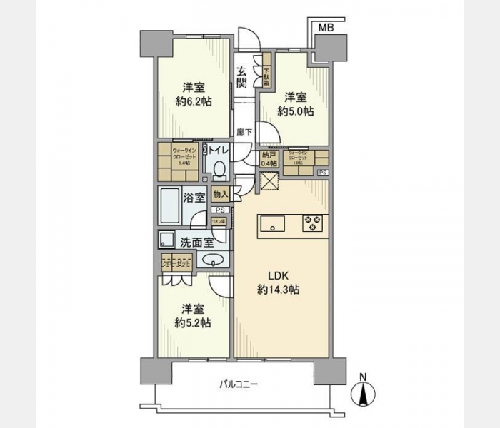 LDK 14.3 畳 洋室 6.2 畳 洋室 5.2 畳 洋室 5 畳 |