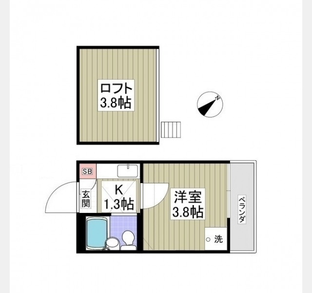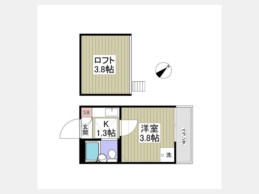 洋室 3.8 畳 1 室 K 1.3 畳 1 室 ロフト3.8帖 |