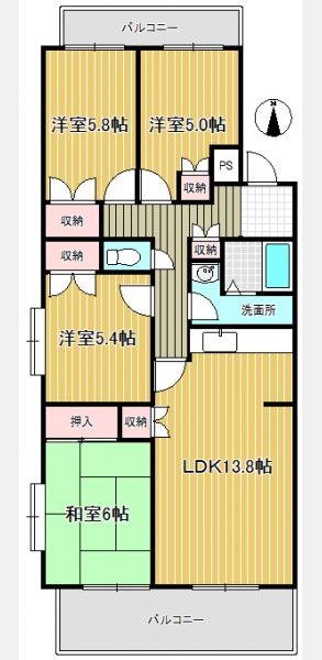 LDK 13.8 畳 洋室 5.8 畳 洋室 5.4 畳 洋室 5 畳 和室 6 畳 |