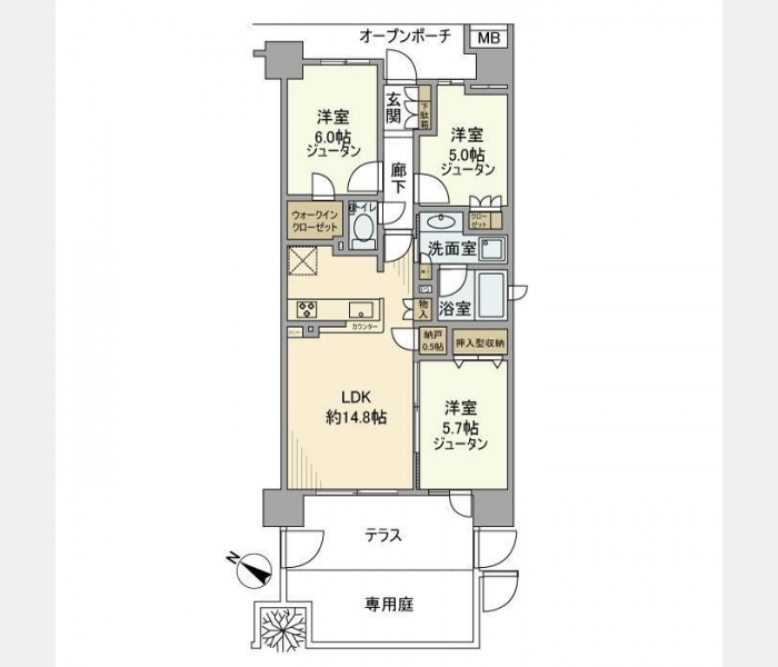 LDK 14.8 畳 洋室 6 畳 洋室 5.7 畳 洋室 5 畳 |