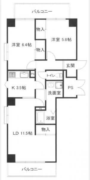 LDK 11.5 畳 洋室 6.4 畳 洋室 5.8 畳 |