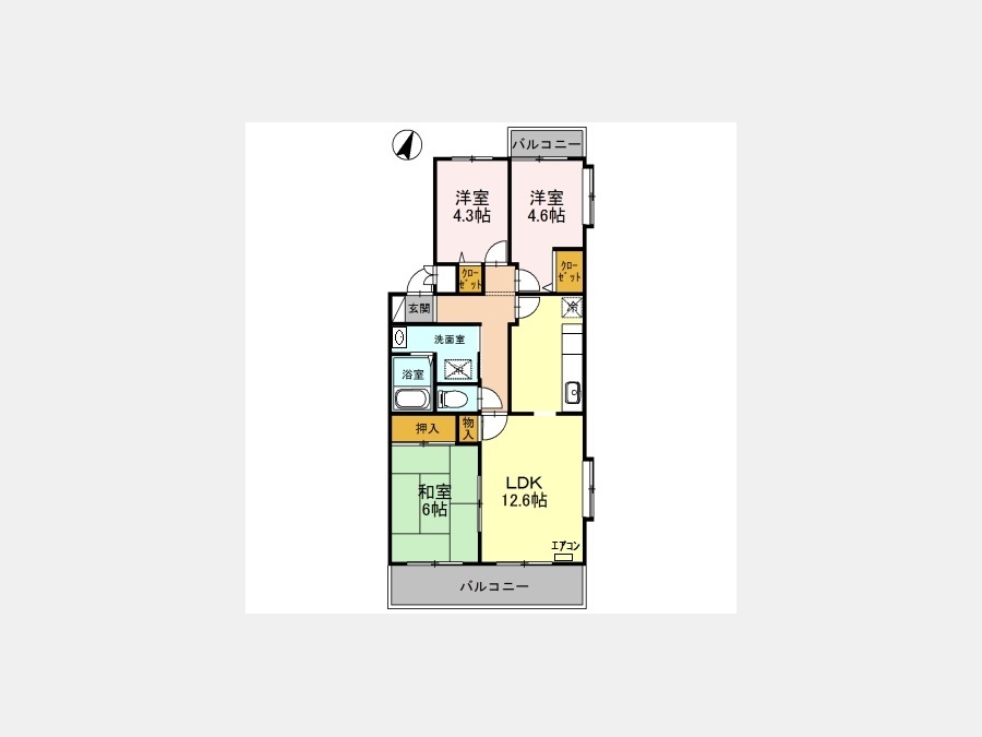 LDK 12.6 畳 洋室 4.6 畳 洋室 4.3 畳 和室 6 畳 |