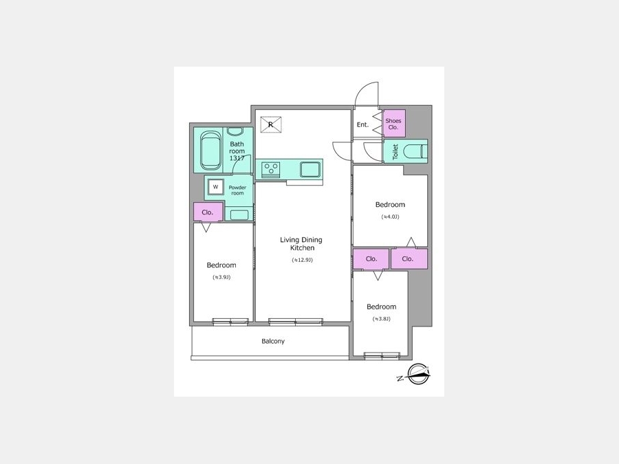 LDK 12.9 畳 洋室 4 畳 洋室 3.9 畳 洋室 3.8 畳 |
