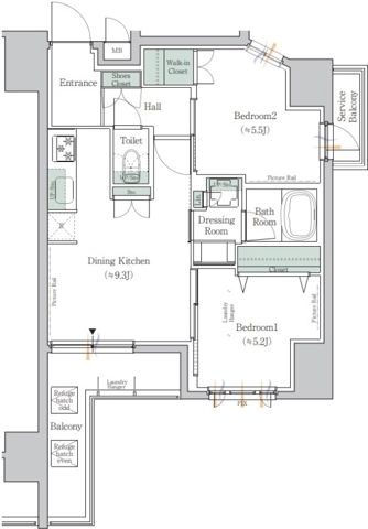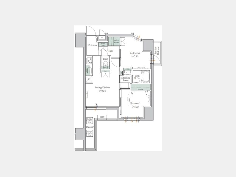 洋室 5.5 畳 洋室 5.2 畳 LDK 9.3 畳 |