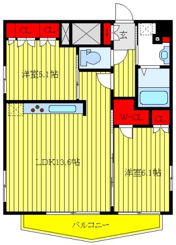 洋室 5.1 畳 洋室 6.1 畳 LDK 13.6 畳 |