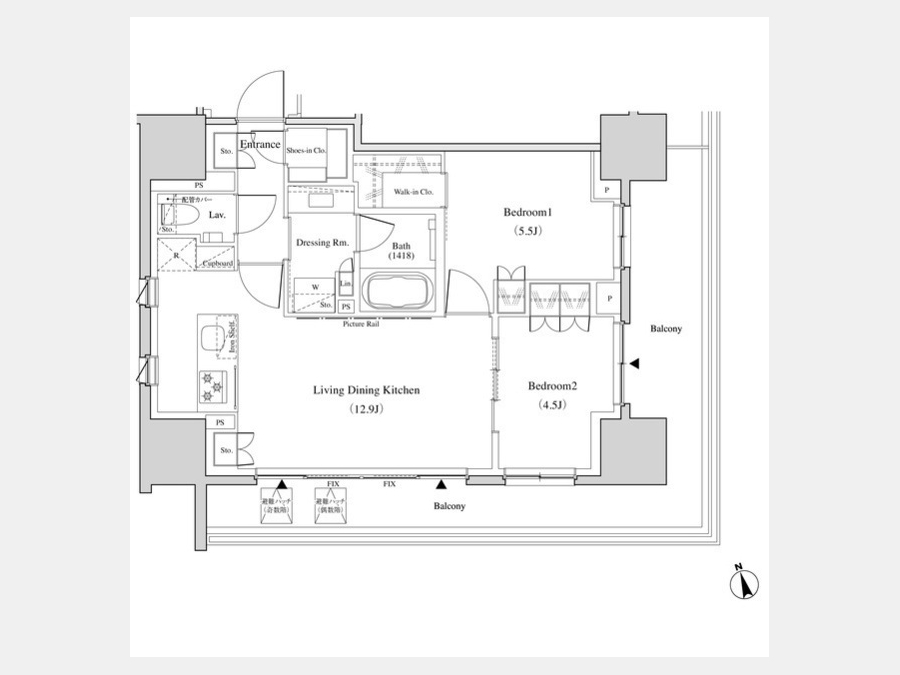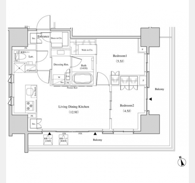 LDK 12.9 畳 1 室 洋室 5.5 畳 1 室 洋室 4.5 畳 1 室 |