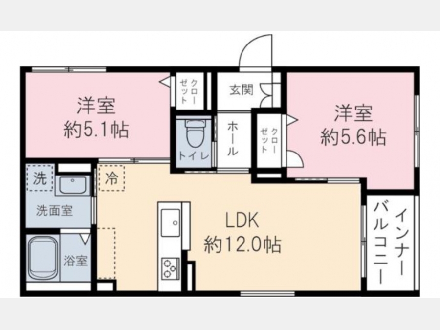 LDK 12 畳 1 室 洋室 5.6 畳 1 室 洋室 5.1 畳 1 室 |