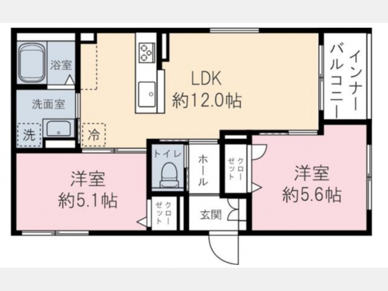 LDK 12 畳 1 室 洋室 5.6 畳 1 室 洋室 5.1 畳 1 室 |