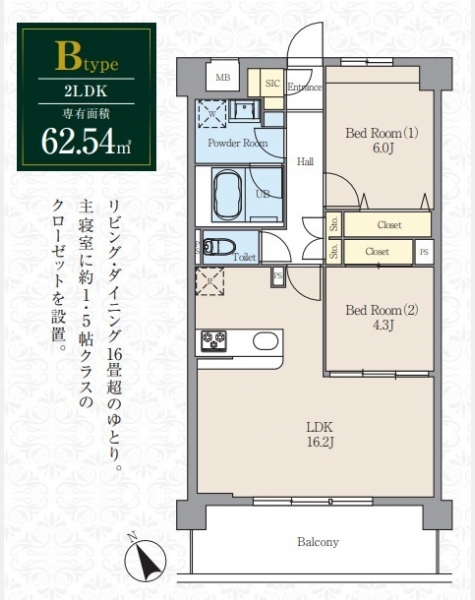 | 専有面積 | 62.54m² | バルコニー面積 | |