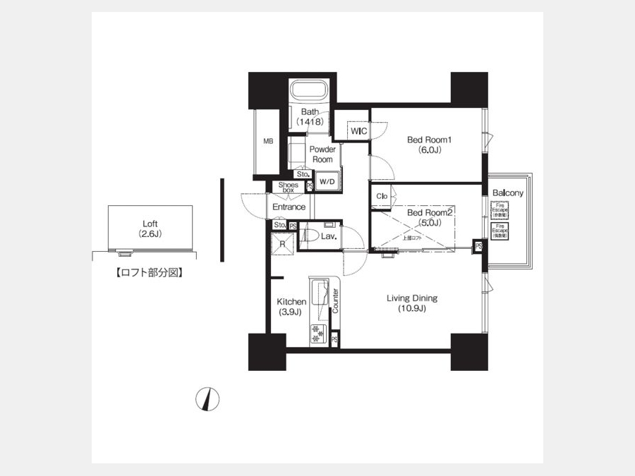 | 設備・条件 | 2階以上、バス・トイレ別、温水洗浄便座、室内洗濯機置き場、ロフト付き、エアコン、ウォークインクローゼット、即入居可、礼金なし、BSアンテナ、CSアンテナ、CATV、宅配ボックス | ||