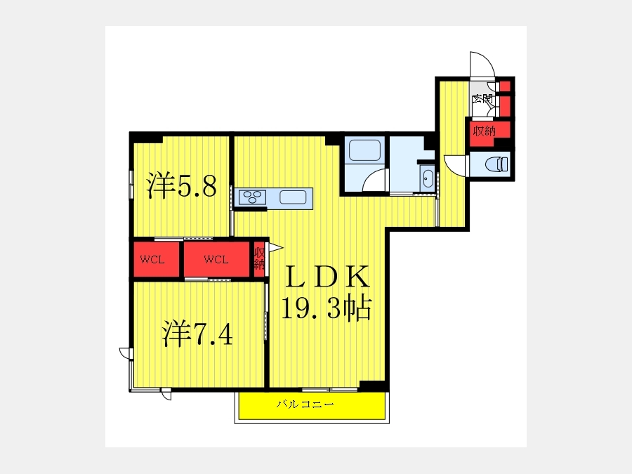 洋室 5.8 畳 洋室 7.4 畳 LDK 19.3 畳 |
