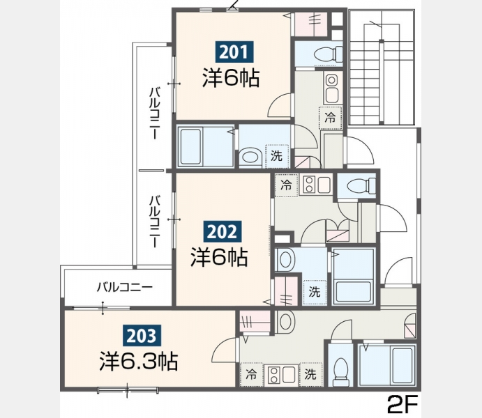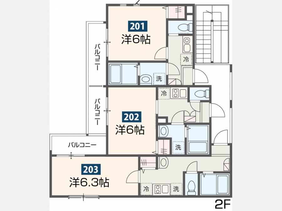 | 設備・条件 | 2階以上、角部屋、バス・トイレ別、温水洗浄便座、浴室乾燥機、追い焚き、室内洗濯機置き場、フローリング、エアコン、バルコニー、礼金なし、敷金なし、インターネット対応、オートロック、TVドアホン、宅配ボックス、プロパンガス | ||
