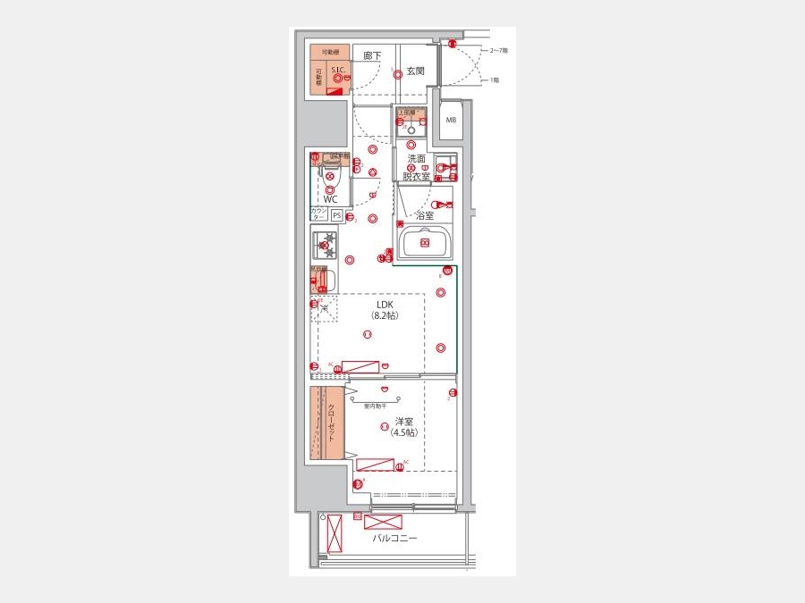 洋室 4.5 畳 1 室 LDK 8.2 畳 1 室 |