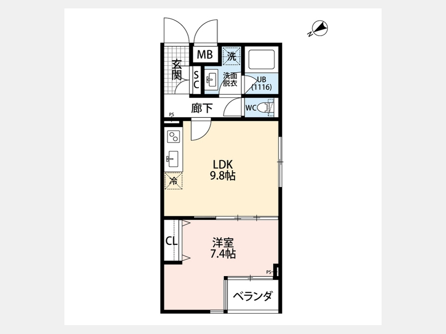 洋室 7.4 畳 1 室 LDK 9.8 畳 1 室 |