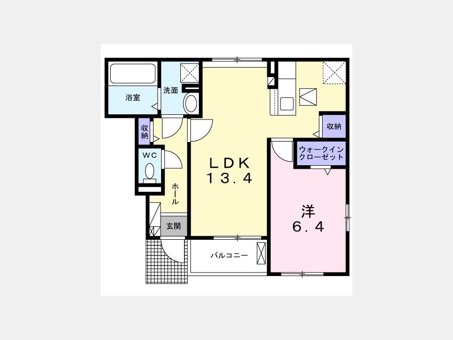 LDK 13.4 畳 1 室 洋室 6.4 畳 1 室 |