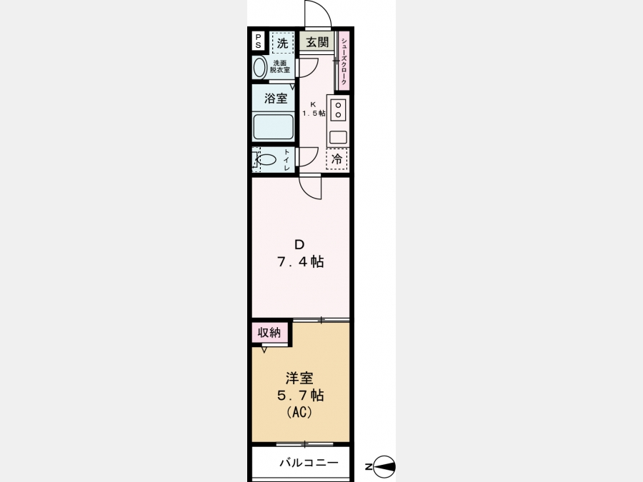 D 7.4 畳 1 室 K 1.5 畳 1 室 洋室 5.7 畳 1 室 |