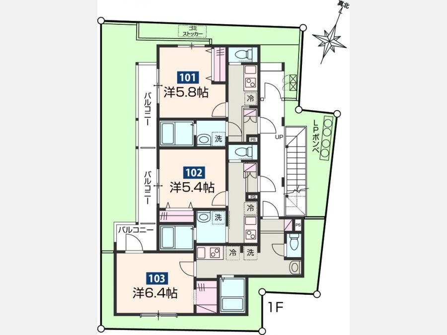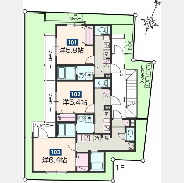 | 設備・条件 | 1階、角部屋、システムキッチン、バス・トイレ別、温水洗浄便座、浴室乾燥機、追い焚き、室内洗濯機置き場、フローリング、エアコン、バルコニー、礼金なし、敷金なし、オートロック、TVドアホン、宅配ボックス、プロパンガス | ||