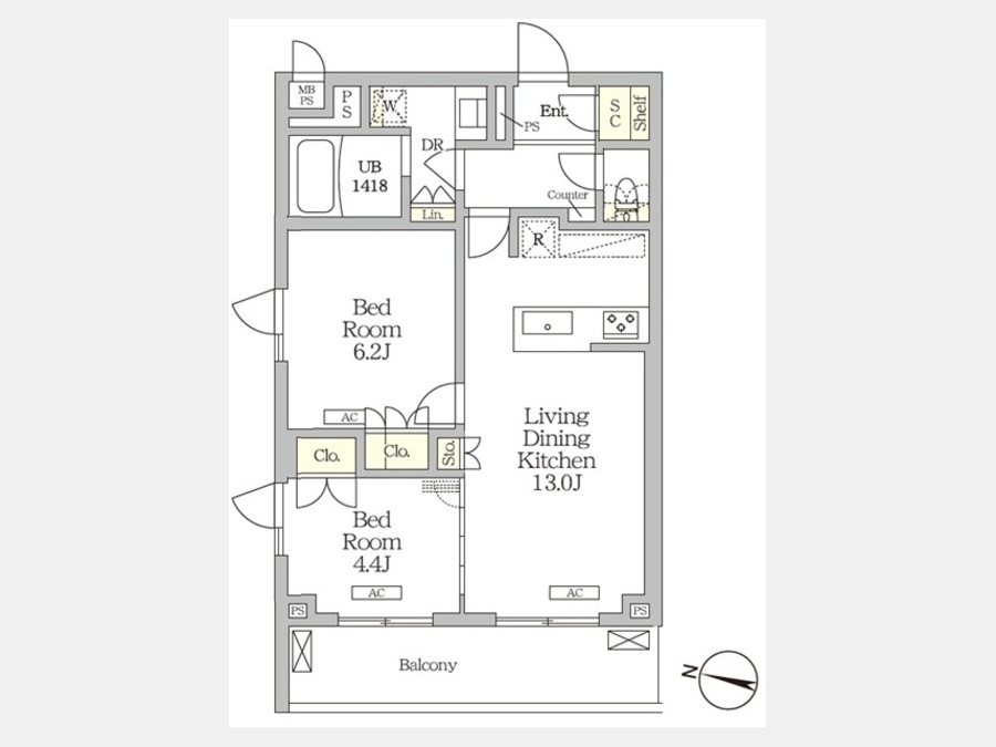 LDK 13 畳 洋室 6.2 畳 洋室 4.4 畳 |