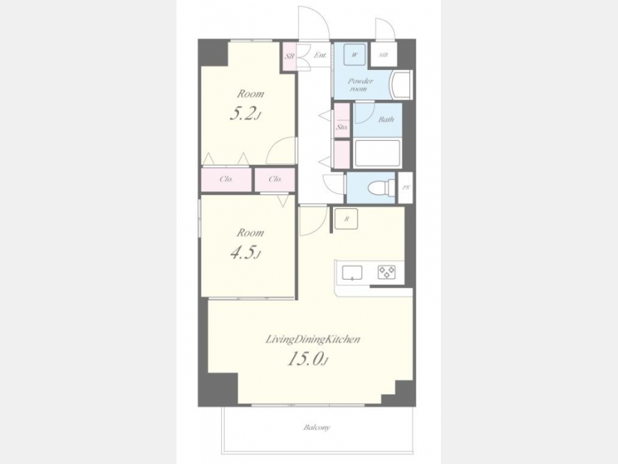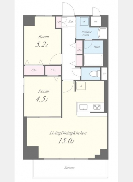 洋室 5.2 畳 1 室 洋室 4.5 畳 1 室 LDK 15 畳 1 室 |