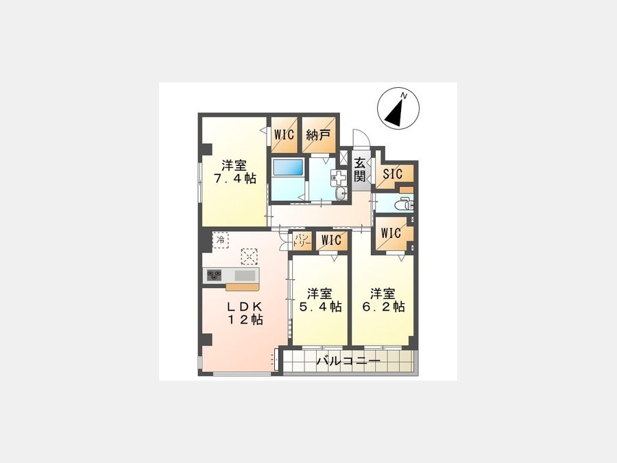 LDK 12 畳 洋室 7.4 畳 洋室 5.4 畳 洋室 6.2 畳 |