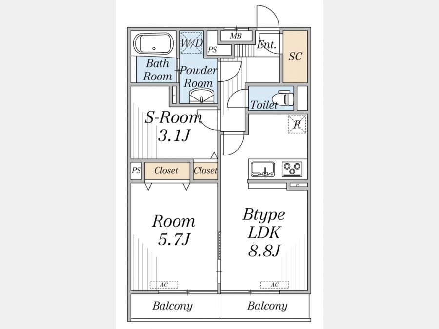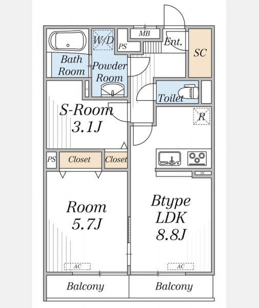 LDK 8.8 畳 1 室 洋室 5.7 畳 1 室 S 3.1 畳 |