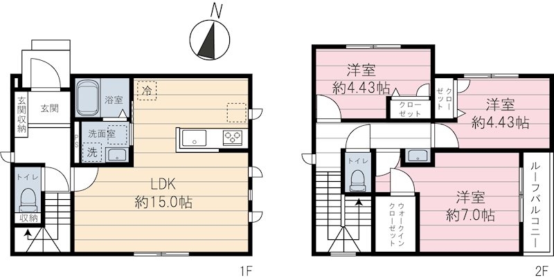 LDK 15 畳 1 階 1 室 洋室 7 畳 2 階 1 室 洋室 4.4 畳 2 階 2 室 |