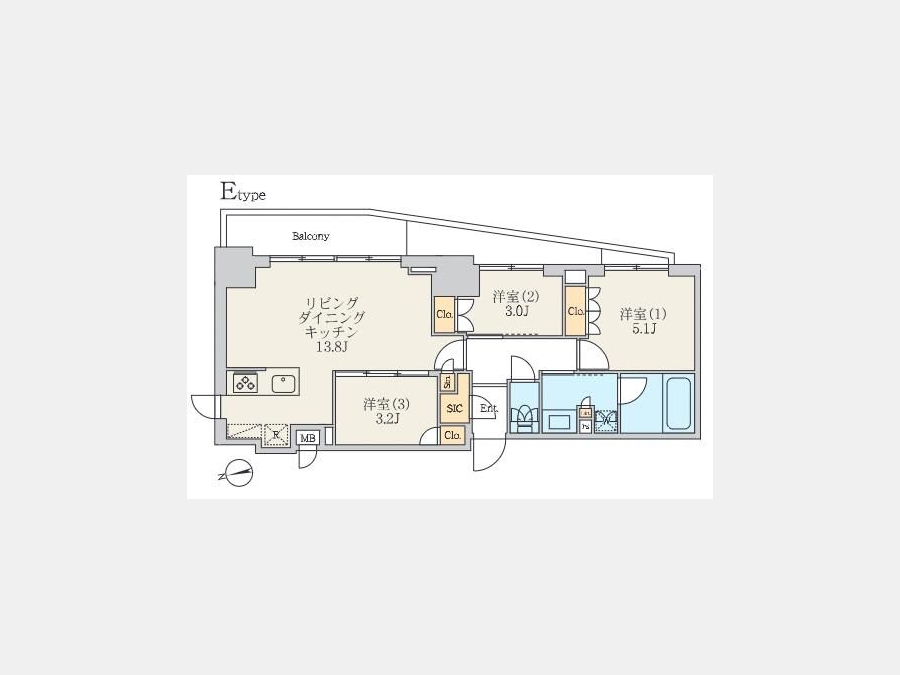 洋室 5.1 畳 1 室 洋室 3 畳 1 室 洋室 3.2 畳 1 室 LDK 13.8 畳 1 室 |