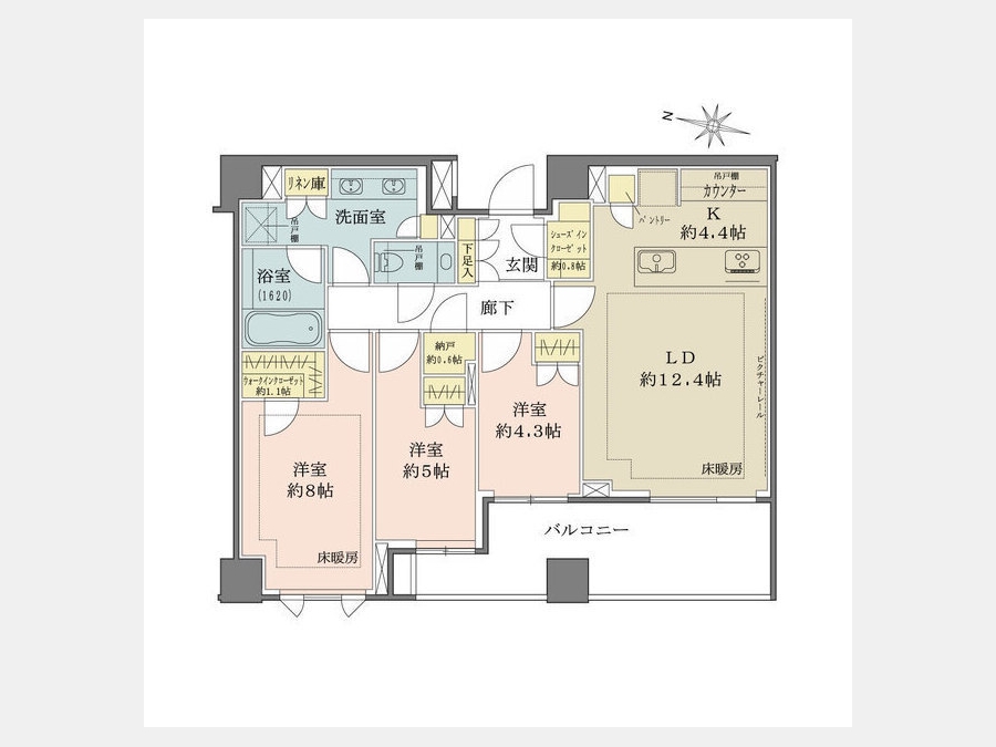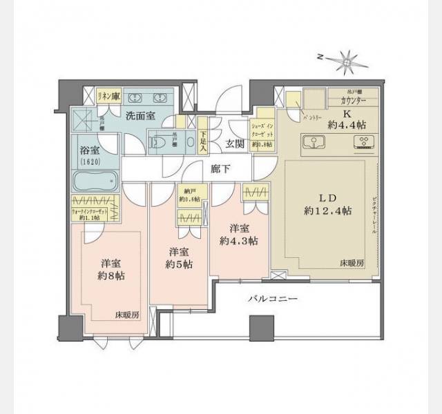 洋室 8 畳 洋室 5 畳 洋室 4.3 畳 LD 12.4 畳 K 4.4 畳 |